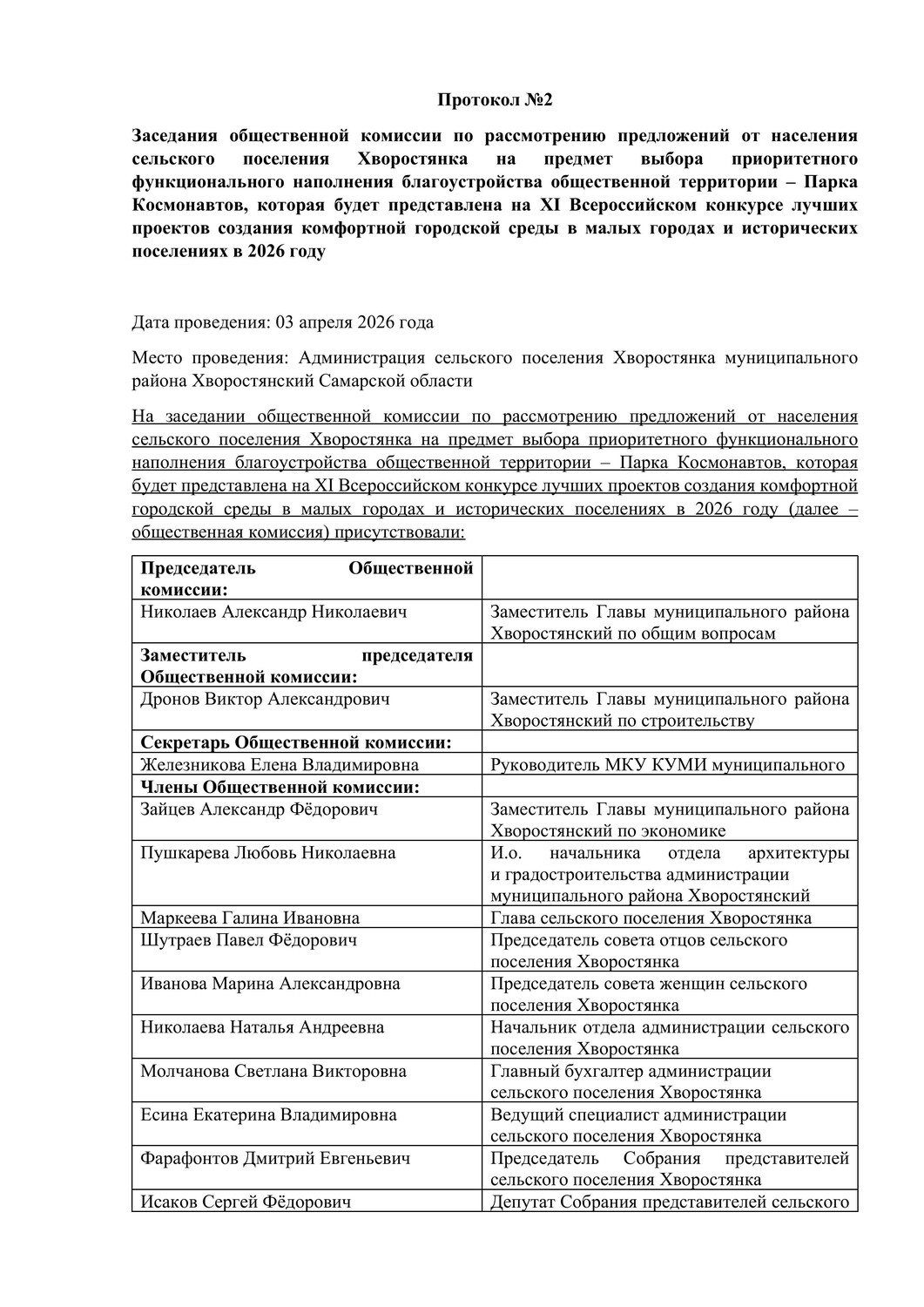 Заседания общественной комиссии по рассмотрению предложений от населения сельского поселения Хворостянка на предмет выбора приоритетного функционального наполнения благоустройства общественной территории – Парка Космонавтов, которая будет представлена на XI Всероссийском конкурсе лучших проектов создания комфортной городской среды в малых городах и исторических поселениях в 2026 году