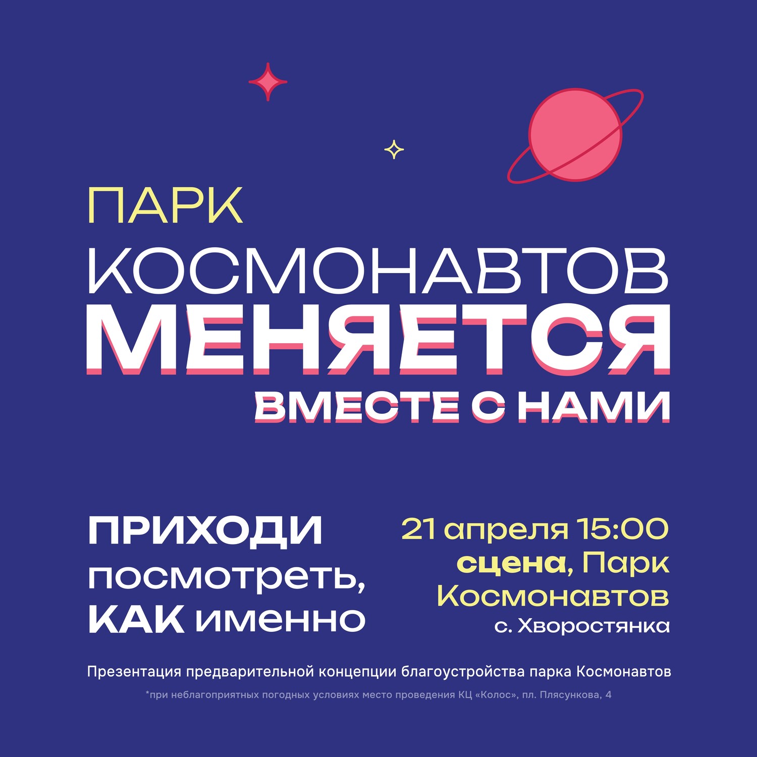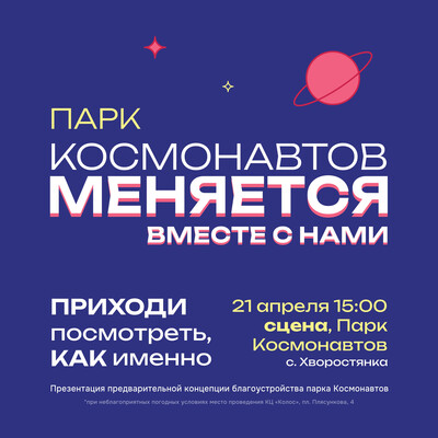 Уже несколько месяцев наша команда трудилась над проектом парка. Все это время мы проводили встречи с жителями, бережно собирали и тщательно анализировали каждое предложение, запустили народное голосование и сделали большое исследование. Все, что важно для Парка Космонавтов, легло в основу концепции! Приглашаем вас на презентацию предварительной концепции, где наша большая команда расскажет, каким мы видим парк. После чего, вы сможете высказать мнение и задать вопросы, которые мы учтем при подготовке финальной заявки на конкурс.