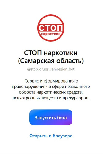 Чат-бот запущен в мессенджере МАХ и позволяет анонимно передать информацию о фактах незаконной рекламы наркотиков (наркограффити, QR коды, рекламные надписи и символы). Сообщить о факте правонарушения можно в любое время суток, чат-бот принимает информацию в режиме реального времени. Для того чтобы воспользоваться сервисом необходимо: - перейти по ссылкам в мессенджере МАХ — @stop_drugs_samregion_bot , в браузере https://max.ru/stop_drugs_samregion_bot и нажатием кнопки «Создать пост» присоединиться к чату; - создать пост, содержащий фотографии и информацию о месте нарушения (геопозиции); - направить информацию в чат. | |